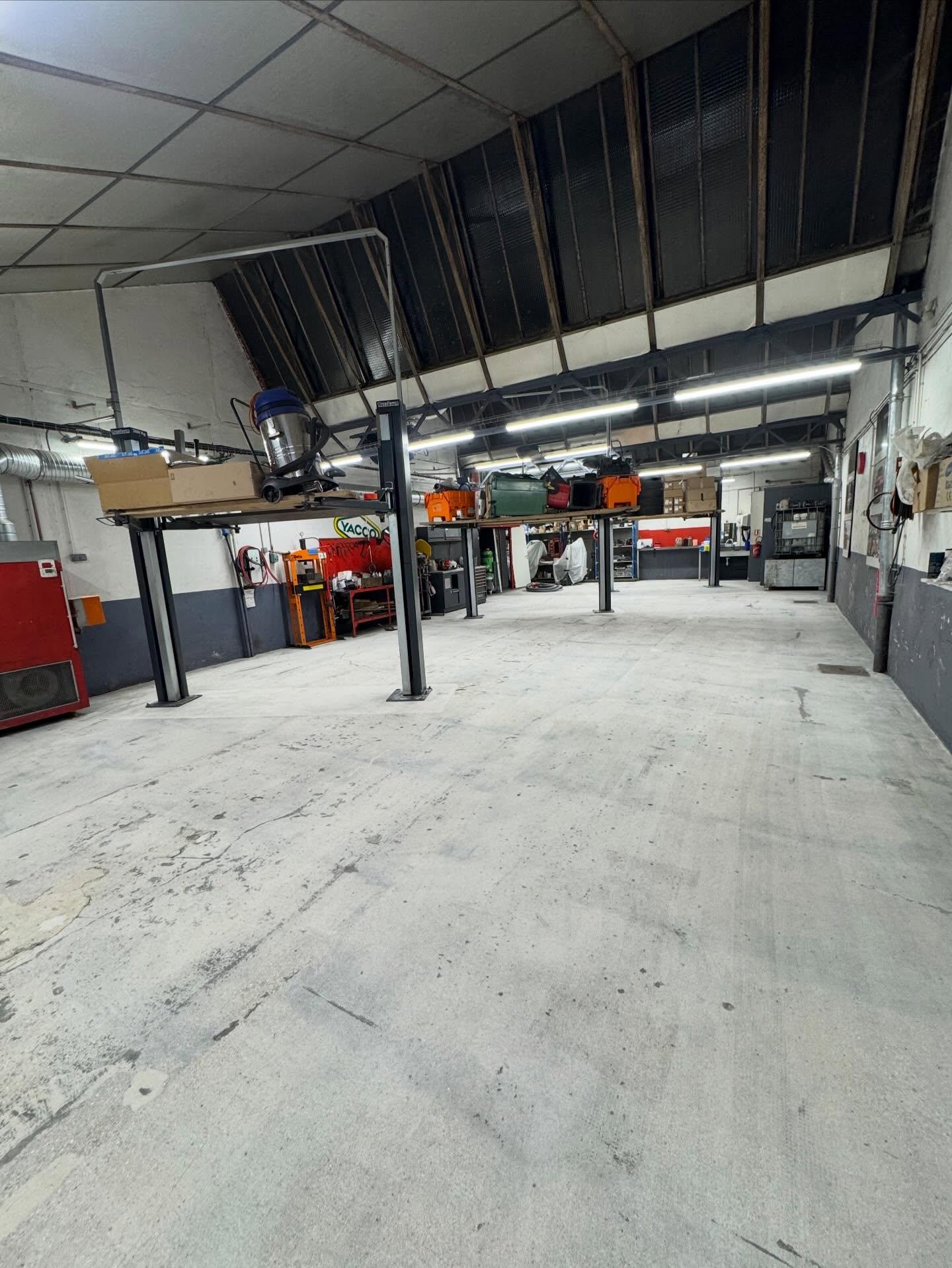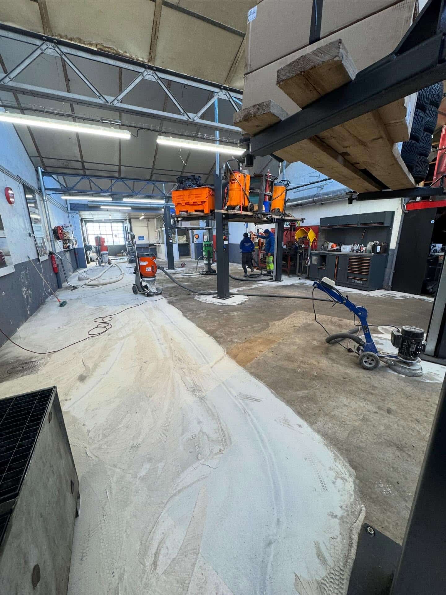 Le sol existant présentait des traces d’usure liées à l’activité mécanique : taches d’huile, zones abrasées et irrégularités du béton. Une préparation complète du support a donc été réalisée afin de garantir l’adhérence et la durabilité du système résine.