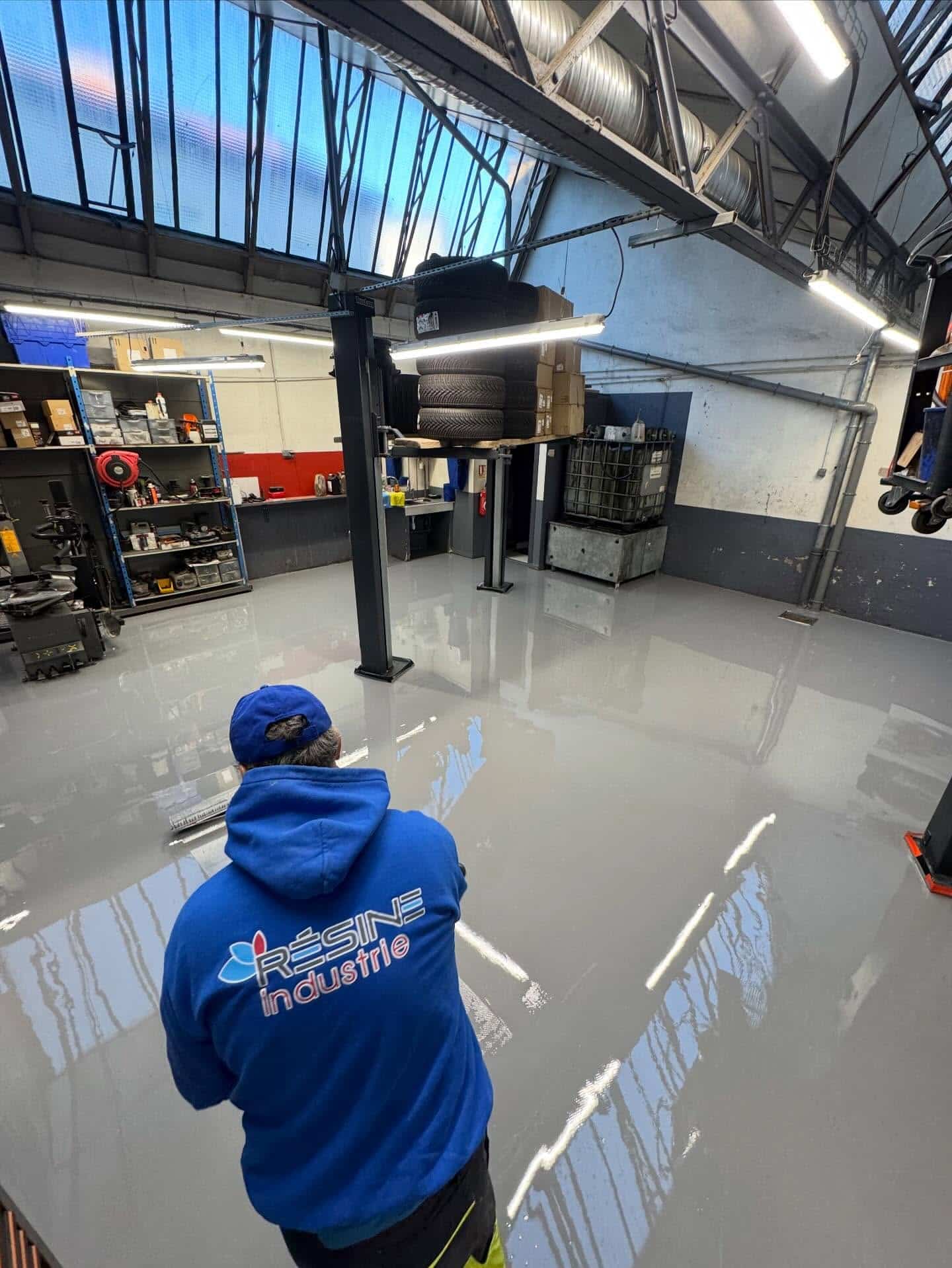 Notre équipe est intervenue pour la pose d’un revêtement de sol en résine autolissante polyuréthane, spécialement conçu pour les zones soumises à un trafic intensif de véhicules et d’équipements d’atelier.