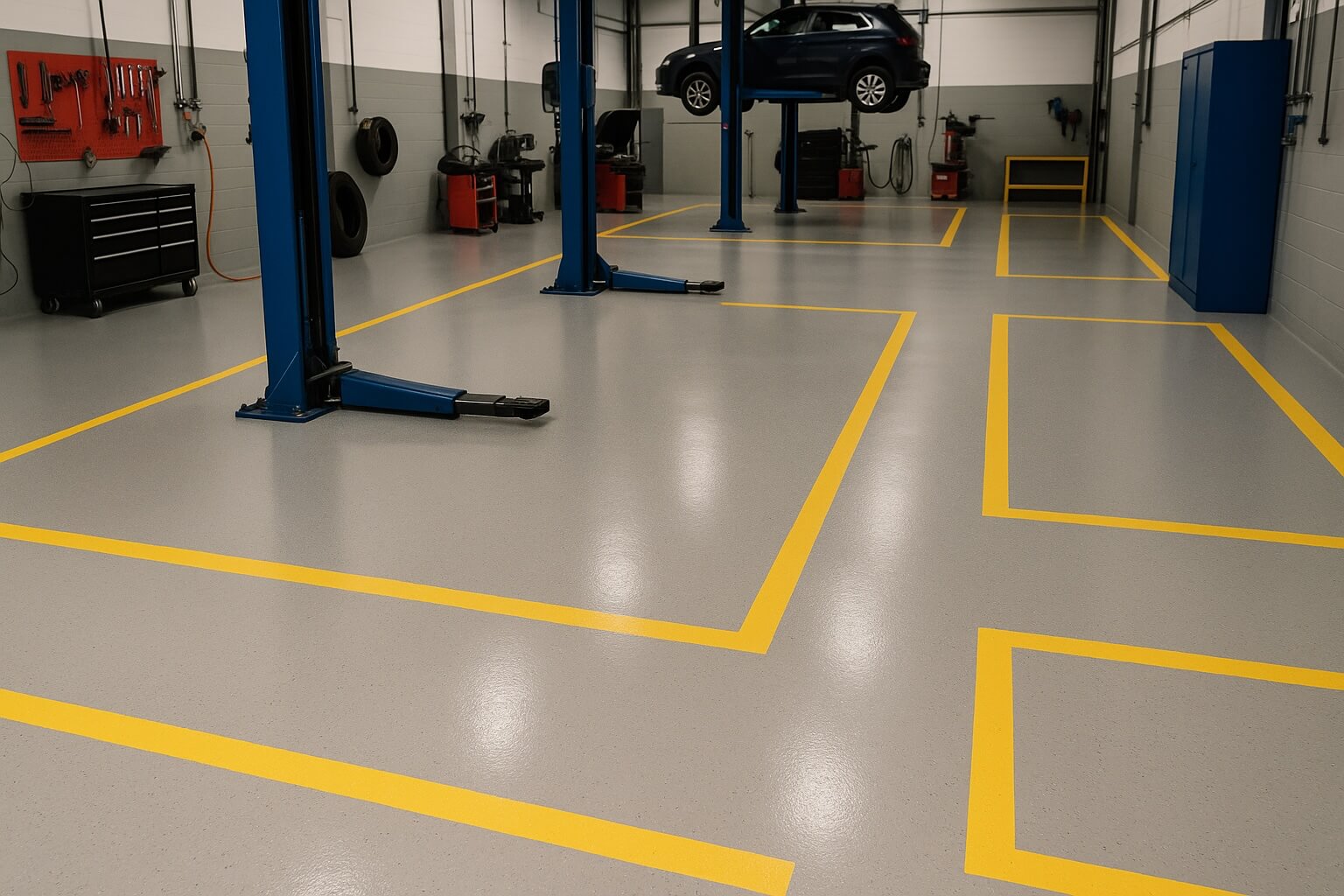 Dans un atelier, le sol est soumis à rude épreuve : circulation de véhicules, manutentions lourdes, chutes d’outils, contact permanent avec huiles et solvants. Un simple carrelage ou béton brut se détériore vite, engendrant fissures, taches persistantes et zones dangereuses pour les équipes.